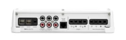 This marine amplifier features white and gray powder-coat finishes, a gasketed cover for the controls and stainless steel hardware for durability in the marine environment.